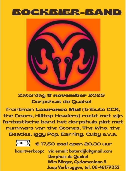08 november 2025 20:30:00 - 08 november 2025 23:59:00Frontman Lawrence Mul met zijn band spelen het dorpshuis plat met nummers van o.m. de Stones, The Who, Iggy Pop, de Beatles, Golden Earring, Cuby en vele anderen.