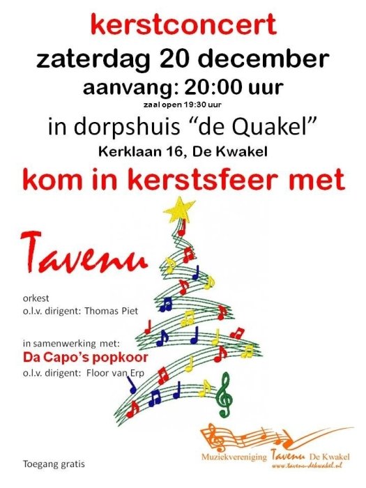 Kom in de kerststemming op zaterdag 20 december in het dorpshuis De Quakel tijdens het kerstconcert van Tavenu. Samen met popkoor Da Capo speelt Tavenu bekende kerstliederen en stemmige muziek voor deze tijd van het jaar. Ook het publiek mag natuurlijk meezingen.