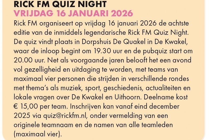 Inschrijven kan door jouw team vanaf eind december 2025 aan te melden via quiz@rickfm.nl onder vermelding van jullie originele teamnaam en de namen van de leden (max 4) van het team. We vragen jullie om op de avond van de Rick FM Quiz Night het inschrijfgeld contant en gepast mee te nemen. We kijken er naar uit om jullie allemaal weer te zien en samen de Quiz Night te spelen. Tot de 16de januari 2026!