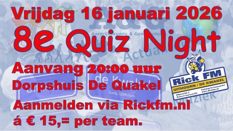 We erg blij om jullie te kunnen informeren dat de inmiddels legendarische Rick FM Quiz Night ook in 2026 wordt georganiseerd. Ook deze 8e editie wordt weer een geweldige quiz, met net als andere jaren veel enthousiaste deelnemers. Even wat informatie:
