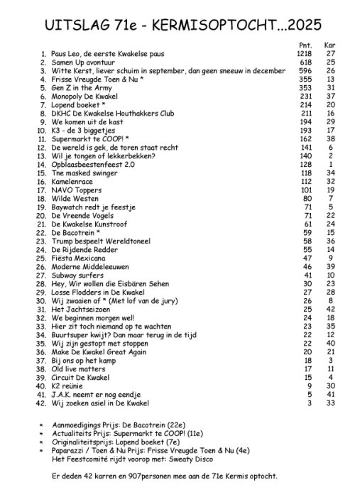 2025 - Kermisoptocht (71) Groepen 1-Paus Leo, de eerste Kwakelse paus 2-Samen Up avontuur 3-Witte Kerst, liever schuim in september, dan geen sneeuw … 4-Frisse Vreugde Toen & Nu * (Paparazzi Toen & … 5-Gen Z in the Army 6-Monopoly De Kwakel 7-Lopende boeket * (Originaliteitsprijs) 8-DKHC De Kwakelse Houthakkers Club 9-We komen uit de kast 10-K3 de 3 biggetjes 11-Supermarkt te COOP! 12-De wereld is gek, de toren staat recht 13-Wil je tongen of lekkerbekken? 14-Opblaasbeestenfeest 2.0 15-The masked swinger 16-Kamelenrace 17-NAVO Toppers 18-Wilde Westen 19-Baywatch redt je feestje 20-Vreemde Vogels 21-De Kwakelse Kunstroof 22-De Bacotrein * (Aanmoedigingsprijs) 23-Trump bespeelt Wereldtoneel 24-De Rijdende Redder 25-Fiësta Mexicana 26-Moderne Middeleeuwen 27-Subway surfers Hey! Wir wollen die Eisbären Sehen 29-Losse Flodders in De Kwakel 30-Wij zwaaien af * (Wit Lof van de Jury) 31-Het Jachtseizoen 32-Wij beginnen morgen wel! 33-Hier zit toch niemand op te wachten 34-Buurtsuper kwijt? Dan maar terug in de tijd. 35-Wij zijn gestopt met stoppen 36-Make De Kwakel Great Again 37-Bij ons op het kamp 38-Old lives matters 40-K3 Reünie 41-J.A.K. neemt er nog Eendje 42-Wij zoeken asiel in De Kwakel Sweaty Disco Het Feestcomité Muziekvereniging Tavenu 2025 Uitslag van de 71e Kermisoptocht Tot Volgend jaar, het was weer geweldig! Paparazzi Media
