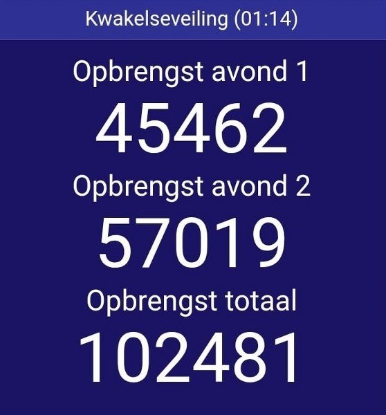 Om 01:15 uur was deze laatste kavel geveild en kon de eindstand opgemaakt worden. Met zijn allen zijn we erin geslaagd om een gigantisch bedrag op te halen van € 57.019,-. Dit bedrag opgeteld met de opbrengst van vorige week, betekent dat er deze 66e editie maar liefst € 102.481,- bij elkaar is geveild. Nog nooit was de opbrengst hoger dan € 91.387,- (in 2022) en nu passeren we zelfs de magische grens van één ton, een grandioze prestatie! Dit betekent eveneens dat de Kwakelse Veiling in zijn bestaan nu meer dan 3 miljoen euro heeft opgehaald voor het verenigingsleven in De Kwakel.